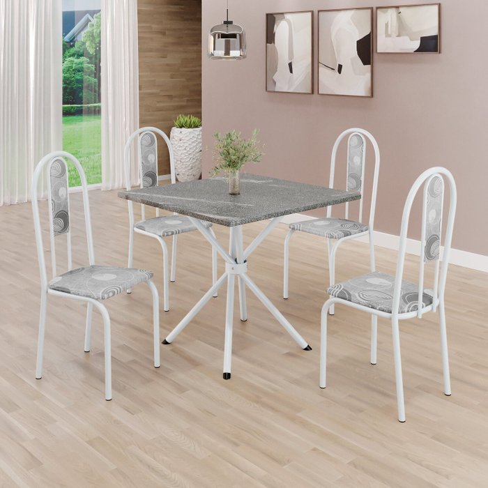 Este conjunto de mesa quadrada e 4 cadeiras oferece estilo e praticidade. Com estrutura tubular em aço para estabilidade, o tampo em pedra granito adiciona sofisticação e resistência a riscos e manchas. As cadeiras combinam harmoniosamente com a mesa, garantindo conforto com estofamento. Ideal para diversos espaços, é perfeito para receber convidados ou desfrutar de refeições em família, criando um ambiente acolhedor e elegante.