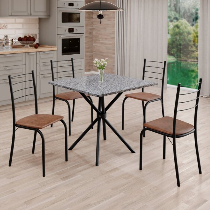 Conjunto Sala de Jantar Mesa Quadrada 75x75cm Tampo Granito Ocre 4 Cadeiras Rio Marrom/Preto