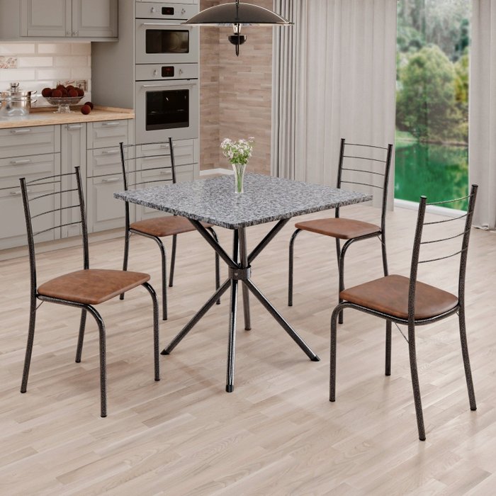 Conjunto Sala de Jantar Mesa Quadrada 75x75cm Tampo Granito Ocre 4 Cadeiras Rio Marrom/ Mart Prata