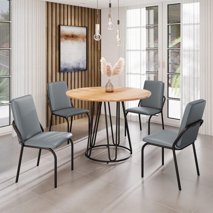Conjunto Sala de Jantar Mesa Redonda 100cm Base Omega Tampo Mdf Malibu Grafite/Preto