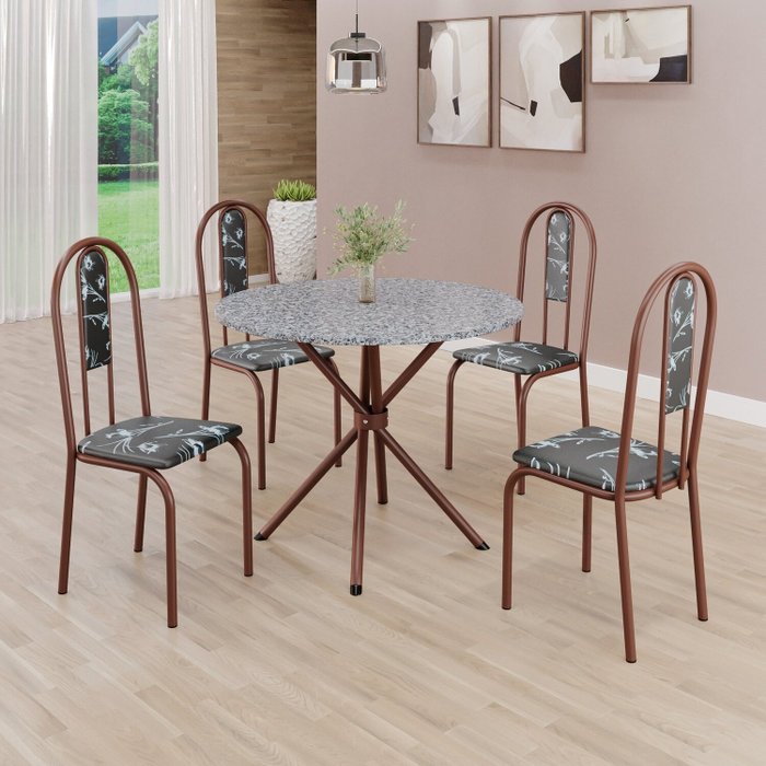 Este conjunto de mesa redonda e 4 cadeiras oferece estilo e praticidade. Com estrutura tubular em aço para estabilidade, o tampo em pedra granito adiciona sofisticação e resistência a riscos e manchas. As cadeiras combinam harmoniosamente com a mesa, garantindo conforto com estofamento. Ideal para diversos espaços, é perfeito para receber convidados ou desfrutar de refeições em família, criando um ambiente acolhedor e elegante.