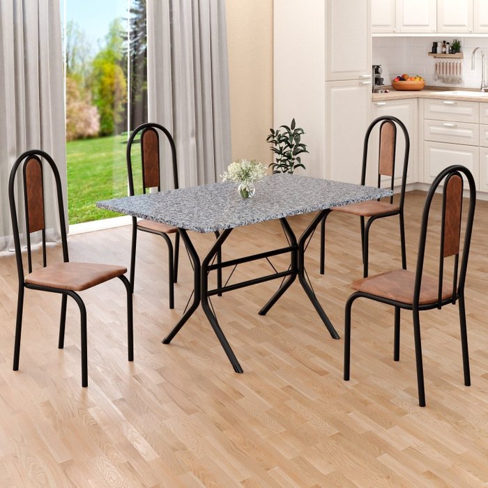 Este conjunto de mesa retangular e 4 cadeiras oferece estilo e praticidade. Com estrutura tubular em aço para estabilidade, o tampo em pedra granito adiciona sofisticação e resistência a riscos e manchas. As cadeiras combinam harmoniosamente com a mesa, garantindo conforto com estofamento. Ideal para diversos espaços, é perfeito para receber convidados ou desfrutar de refeições em família, criando um ambiente acolhedor e elegante.