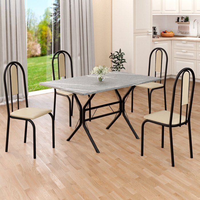 Este conjunto de mesa retangular e 4 cadeiras oferece estilo e praticidade. Com estrutura tubular em aço para estabilidade, o tampo em pedra granito adiciona sofisticação e resistência a riscos e manchas. As cadeiras combinam harmoniosamente com a mesa, garantindo conforto com estofamento. Ideal para diversos espaços, é perfeito para receber convidados ou desfrutar de refeições em família, criando um ambiente acolhedor e elegante.
