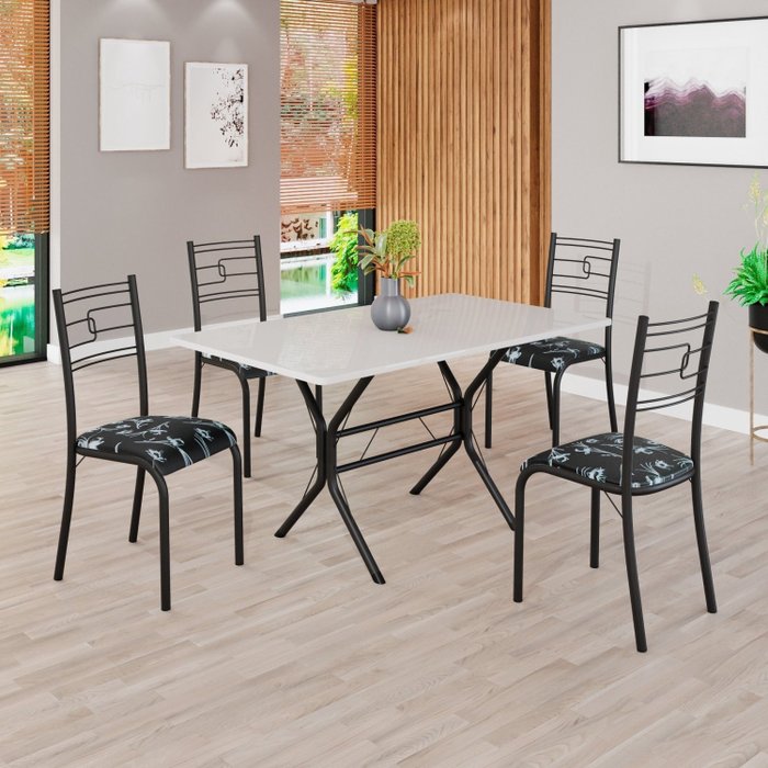 Conjunto Sala de Jantar Mesa Retangular 120x75cm Tampo Madeira Mdp Off White 4 Cadeiras Paraty Preto Floral/Preto