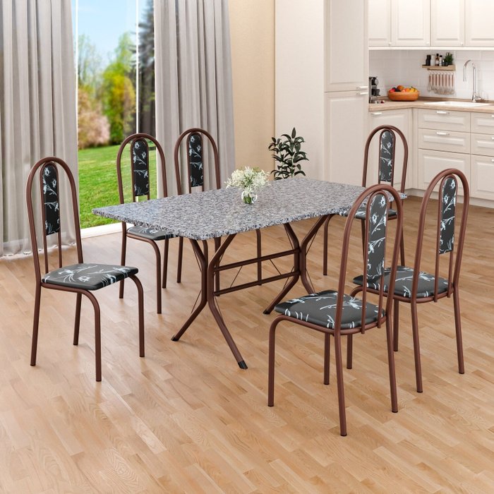 Conjunto Sala de Jantar Mesa Retangular 140x75cm Tampo Granito Ocre 6 Cadeiras Linda Yescasa Preto Floral/Marrom