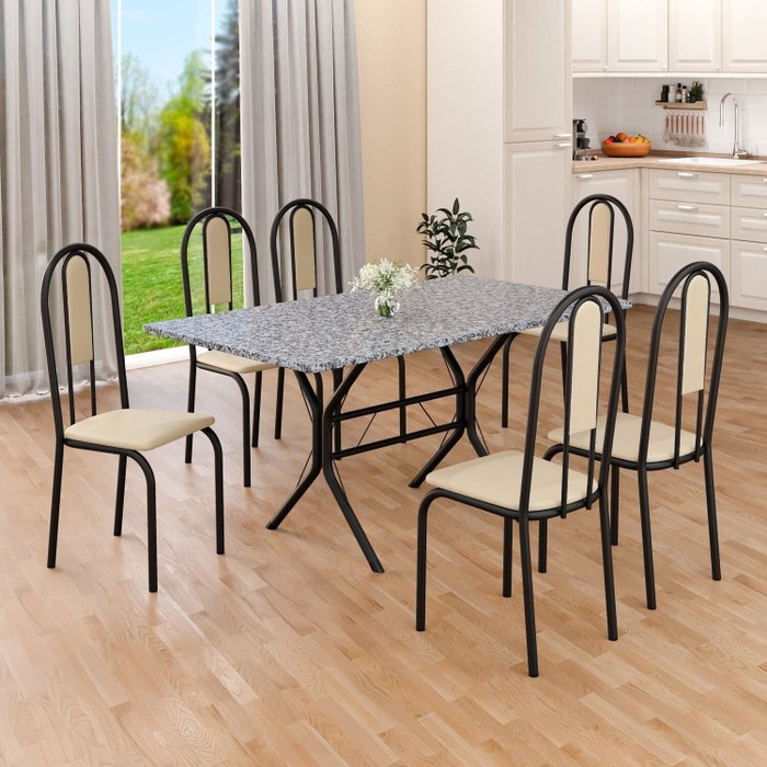 Conjunto Sala de Jantar Mesa Retangular 140x75cm Tampo Granito Ocre 6 Cadeiras Linda Yescasa Creme/Preto