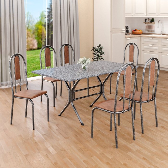 Este conjunto de mesa retangular e 6 cadeiras oferece estilo e praticidade. Com estrutura tubular em aço para estabilidade, o tampo em pedra granito adiciona sofisticação e resistência a riscos e manchas. As cadeiras combinam harmoniosamente com a mesa, garantindo conforto com estofamento. Ideal para diversos espaços, é perfeito para receber convidados ou desfrutar de refeições em família, criando um ambiente acolhedor e elegante.