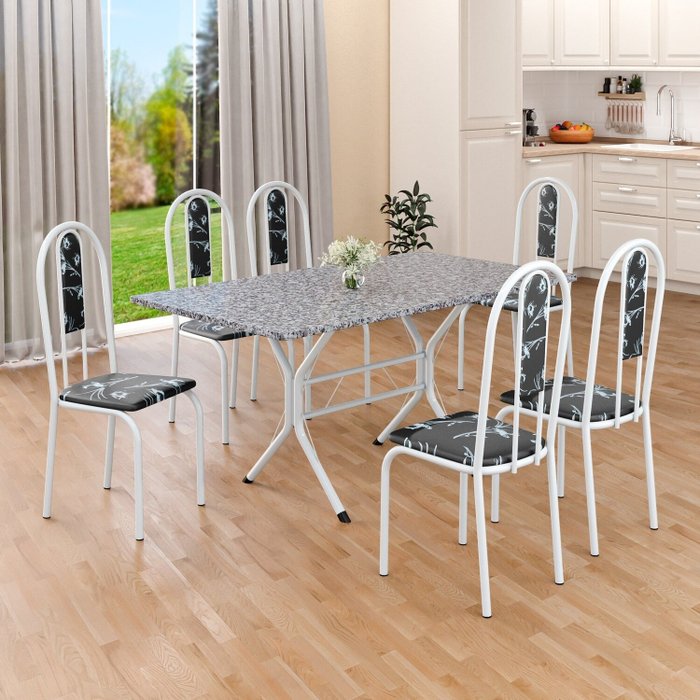 Este conjunto de mesa retangular e 6 cadeiras oferece estilo e praticidade. Com estrutura tubular em aço para estabilidade, o tampo em pedra granito adiciona sofisticação e resistência a riscos e manchas. As cadeiras combinam harmoniosamente com a mesa, garantindo conforto com estofamento. Ideal para diversos espaços, é perfeito para receber convidados ou desfrutar de refeições em família, criando um ambiente acolhedor e elegante.