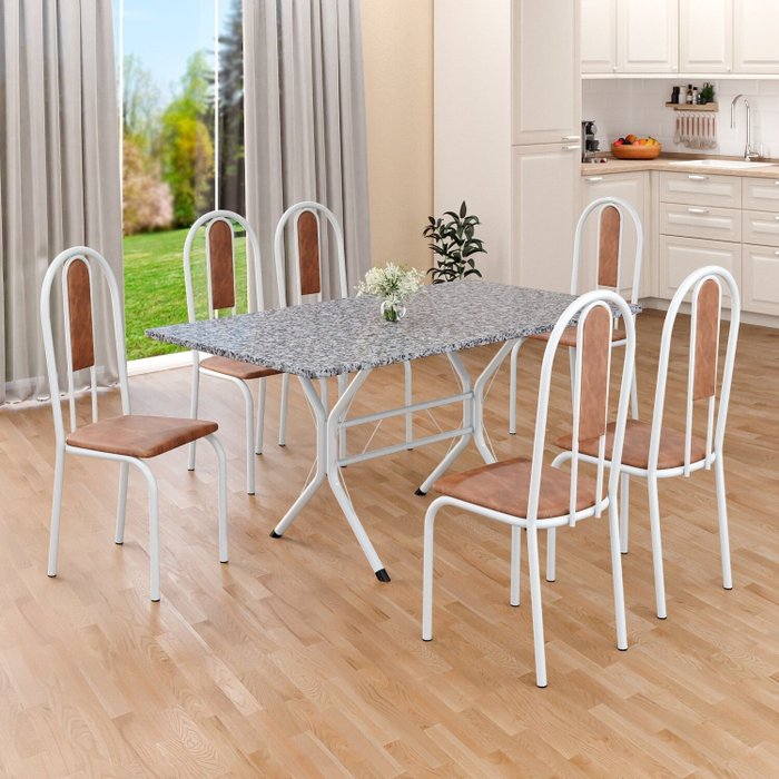 Este conjunto de mesa retangular e 6 cadeiras oferece estilo e praticidade. Com estrutura tubular em aço para estabilidade, o tampo em pedra granito adiciona sofisticação e resistência a riscos e manchas. As cadeiras combinam harmoniosamente com a mesa, garantindo conforto com estofamento. Ideal para diversos espaços, é perfeito para receber convidados ou desfrutar de refeições em família, criando um ambiente acolhedor e elegante.