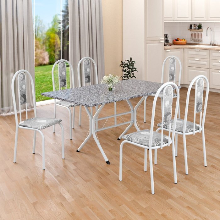 Este conjunto de mesa retangular e 6 cadeiras oferece estilo e praticidade. Com estrutura tubular em aço para estabilidade, o tampo em pedra granito adiciona sofisticação e resistência a riscos e manchas. As cadeiras combinam harmoniosamente com a mesa, garantindo conforto com estofamento. Ideal para diversos espaços, é perfeito para receber convidados ou desfrutar de refeições em família, criando um ambiente acolhedor e elegante.