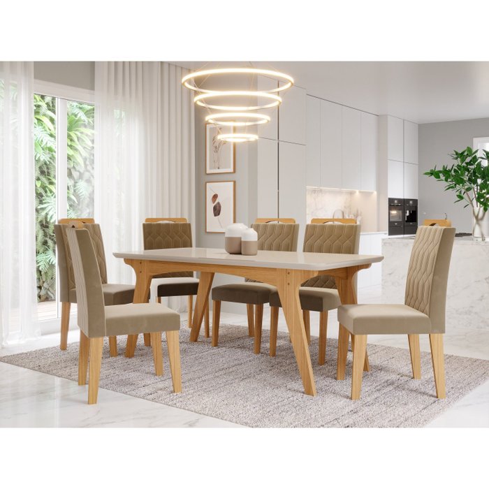 Conjunto Sala de Jantar Mesa Selena 180x90cm Tampo Vidro/MDF com 6 Cadeiras Paola Cimol Nature/Off White/Joli