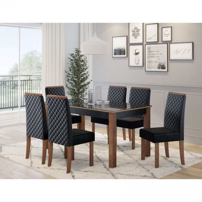 Conjunto Sala de Jantar Mesa Tampo de Vidro com 6 Cadeiras Julia Nogal/Preto