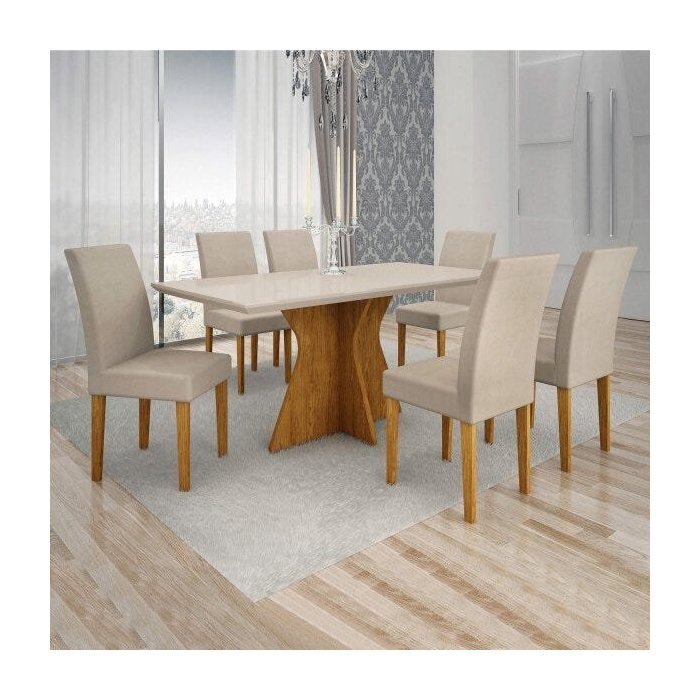 Conjunto Sala de Jantar Mesa Tampo de Vidro Off-white Creta 6 Cadeiras Olímpia Leifer