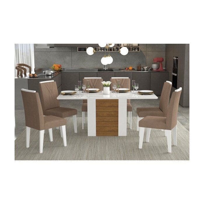 Conjunto Sala de Jantar Mesa Tampo em Vidro Rafaela 6 Cadeiras Nicole Cimol Branco/Savana/Pluma