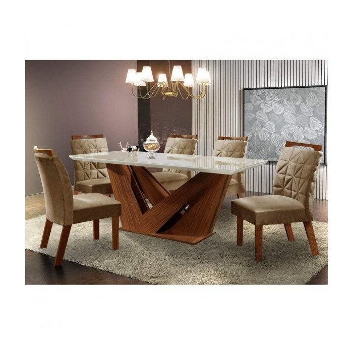 Conjunto Sala de Jantar Mesa Tampo MDF e 6 Cadeiras Apolo Chanfro Premium Ljmóveis Castanho Prêmio/Pena Caramelo