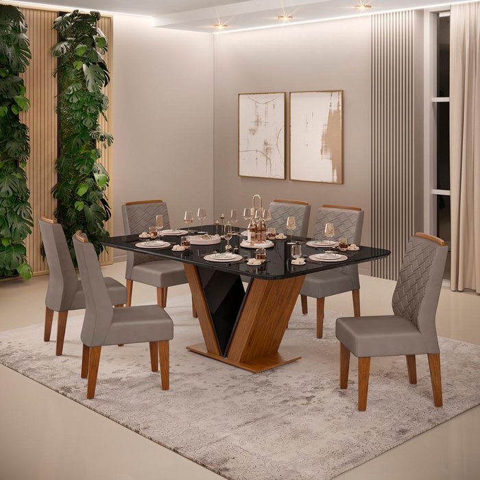 Conjunto Sala de Jantar Mesa Tampo Preto C/ Vidro 6 Cadeiras DJ Móveis Freijó Rute Lunar Lidia