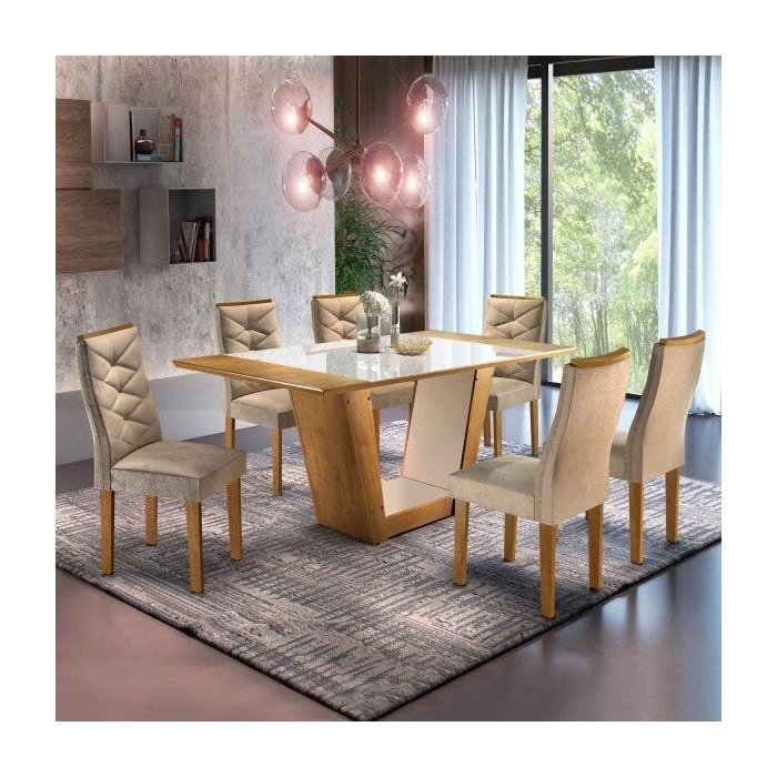 Conjunto Sala de Jantar Mesa Tampo Soft Vidro Ibiza 6 Cadeiras Germany Espresso Móveis Ype/Off White/Suede Pena