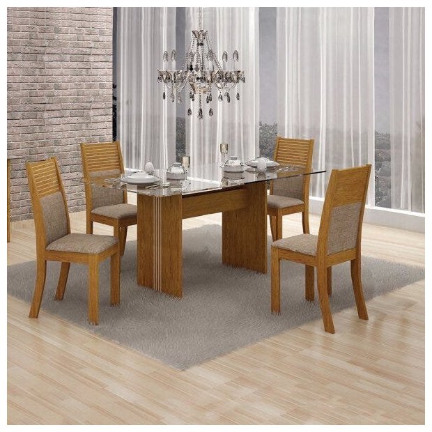 Conjunto Sala de Jantar Mesa Tampo Vidro 120cm 4 Cadeiras Hawai Leifer Imbuia/Linho Bege