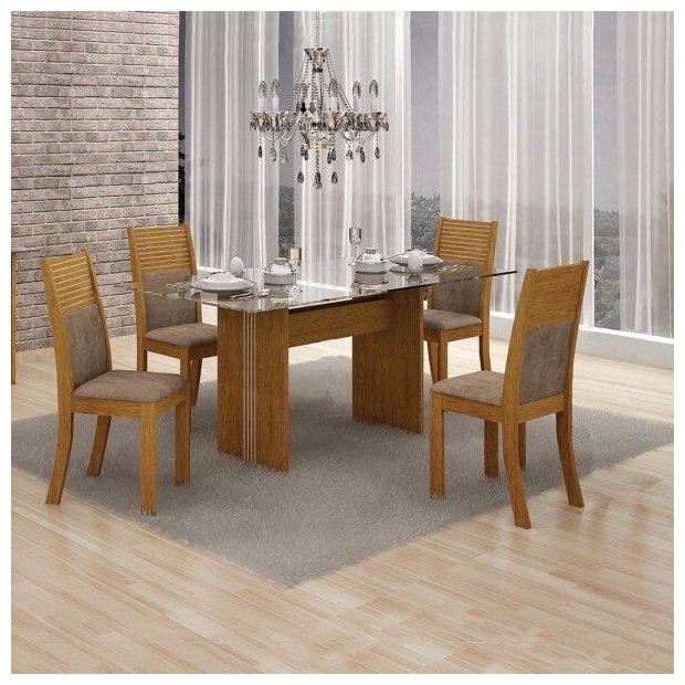 Conjunto Sala de Jantar Mesa Tampo Vidro 120cm 4 Cadeiras Hawai Leifer Imbuia/Animale Capuccino
