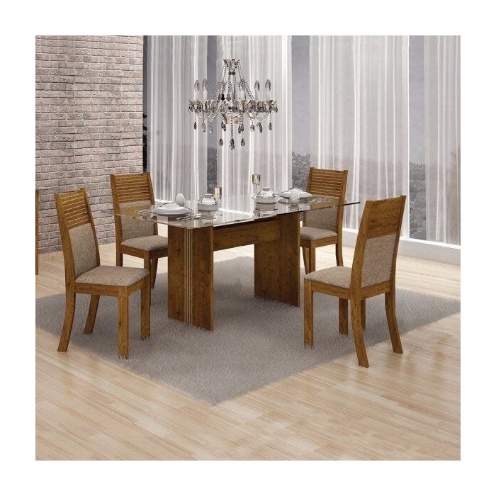 Conjunto Sala de Jantar Mesa Tampo Vidro 120cm 4 Cadeiras Hawai Leifer Canela/Linho Bege