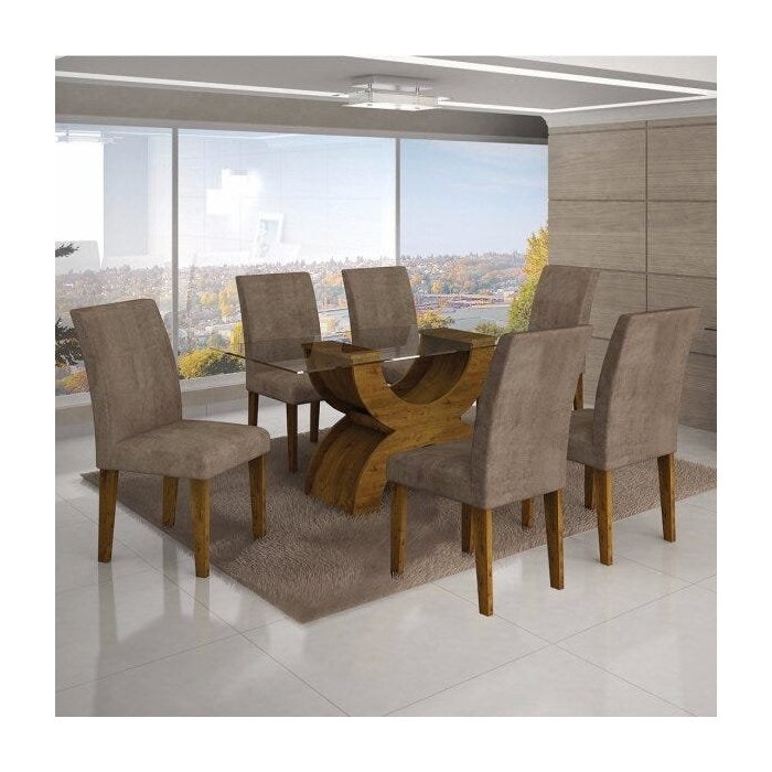 Conjunto Sala de Jantar Mesa Tampo Vidro 160cm 6 Cadeiras Olímpia New Leifer Canela/Animale Capuccino