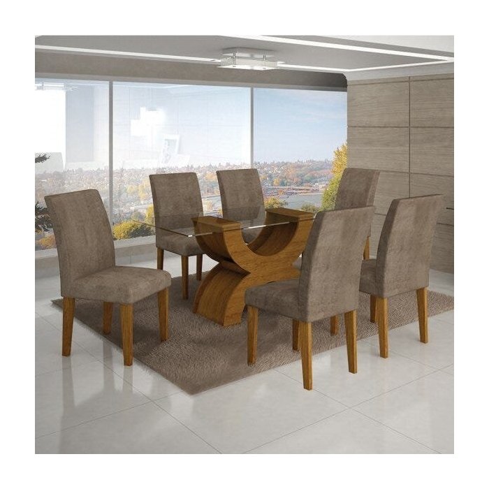 Conjunto Sala de Jantar Mesa Tampo Vidro 160cm 6 Cadeiras Olímpia New Leifer Imbuia Mel/Animale Capuccino