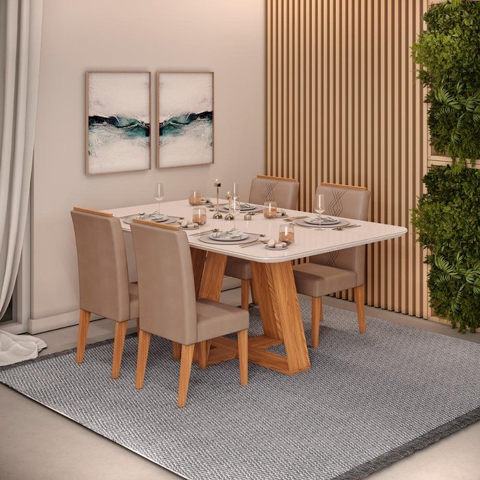 A Mesa Kiara possui um design moderno em formato trapézio inclinado, possibilitando guardar as cadeiras embaixo do tampo, otimizando o espaço da sua sala de jantar. O tampo possui vidro pintado aplicado na madeira com os cantos arredondados tornando a limpeza mais fácil, tornando sua sala de estar mais segura.