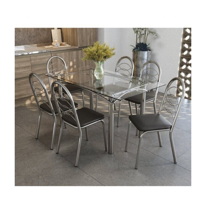 Conjunto Sala de Jantar Mesa Tampo Vidro Retangular Elba com 6 Cadeiras Holanda Crome
