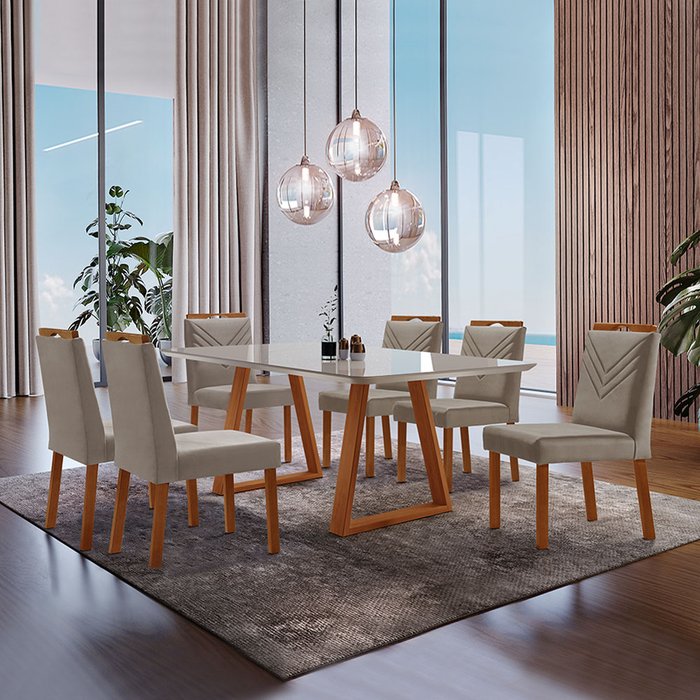 Conjunto Sala de Jantar Mesa Viena Madeira Maciça 160x90cm Tampo Retângular Vidro Off White com 6 Ca