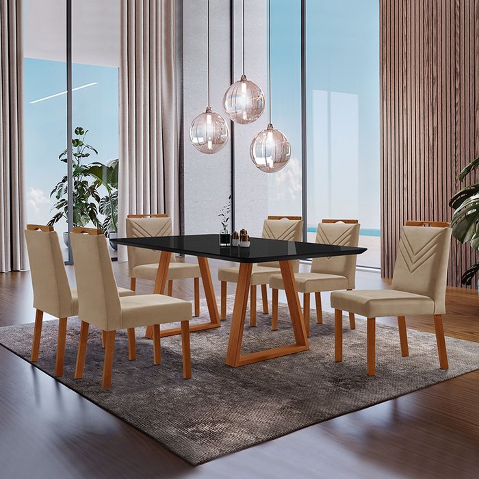 Conjunto Sala de Jantar Mesa Viena Madeira Maciça 160x90cm Tampo Retângular Vidro Preto com 6 Cadeir Veludo Bege