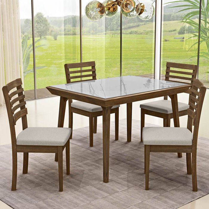 Quanto charme neste conjunto de mesa, não é mesmo? Tudo começa com esta linda combinação de cores clássicas e que são bem fáceis de inserir em um lar, mesa com tampo de vidro aconchegante e sofisticado.