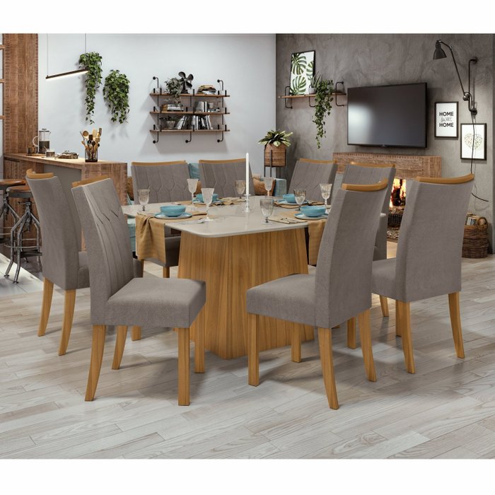 Conjunto Sala Jantar Mesa Quadrada com 8 Cadeiras Lotus Móveis Lopas Rovere Naturale/Off White/Suede Animale Bege
