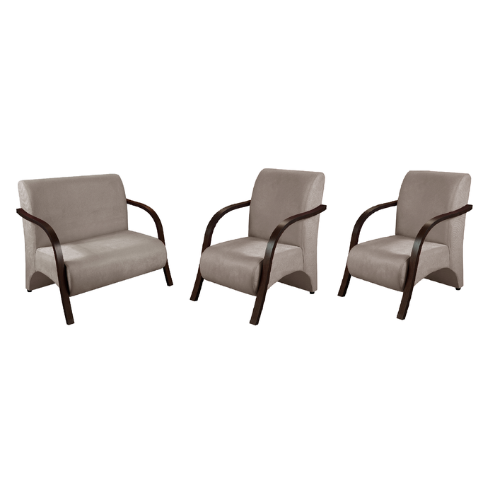 Conjunto Sevilha Namoradeira + 2 Poltronas Decorativa Braço de Madeira Recepção Sala Cinza Capuccino