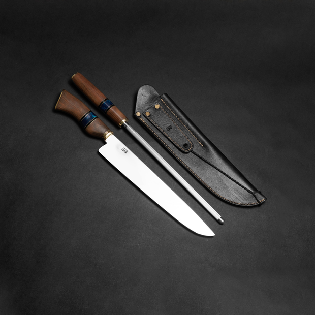 Acompanha bainha artesanal em couro legítimo, projetada para proteger e facilitar o transporte, unindo funcionalidade e estética rústica. Ideal para chefs profissionais e amantes da culinária que valorizam qualidade em cada detalhe.