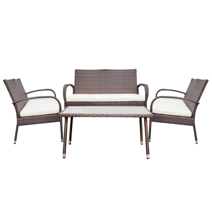 Conjunto Sofá + 2 Poltronas Rattan Assento Estofado + Mesa Com Tampo De Vidro Para área Externa