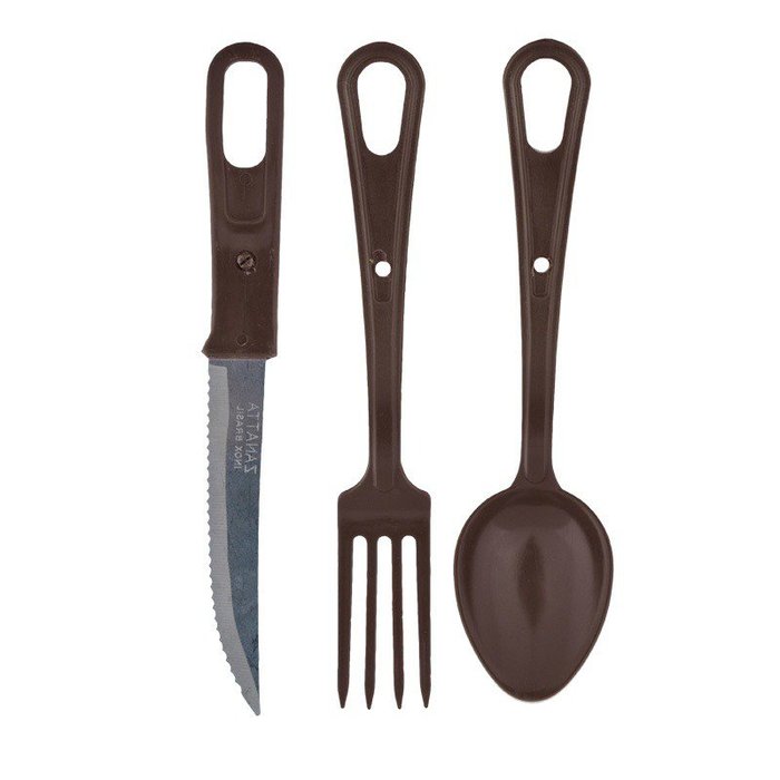 O conjunto de talheres AT1.1170M da Atacado Militar contém três peças: garfo, faca e colher. Ele possui fácil transporte por conter alça para encaixar o mosquetão. Esse conjunto de talheres é resistente, pois conta com lâmina em aço.