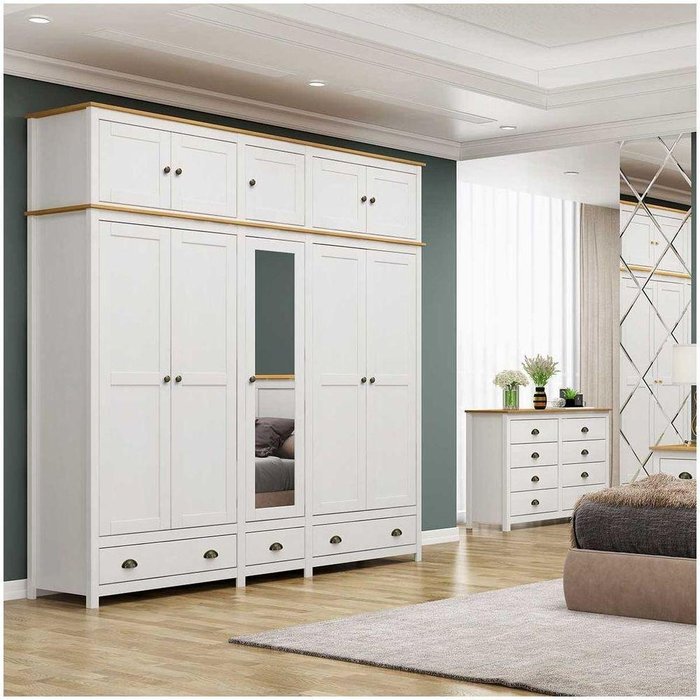 Conjunto Topázio Branco/carvalho Guarda-roupa Casal 5 Portas C/ Maleiro, Cômoda 8 Gavetas Madeira Maciça Pinus - Finestra Conjunto Topázio Branco/Carvalho Guarda-Roupa Casal 5 Portas c/ Maleiro, Cômoda Dupla 8 Gavetas, Madeira Maciça Pinus - Finestra