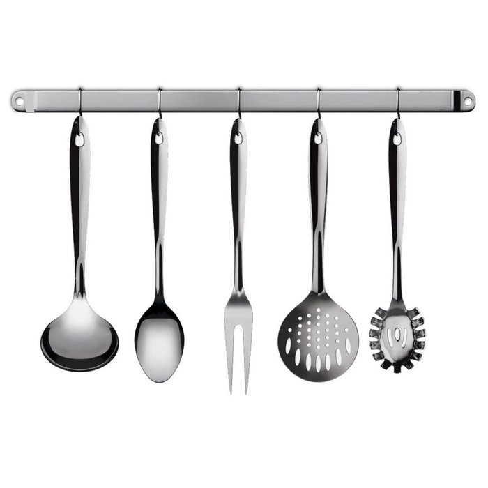 O conjunto de utensílios de cozinha com suporte fixo inox Euro Home deixa sempre a sua mão os 5 utensílios fundamentais para preparar e servir pratos e refeições. Fabricados em inox, os utensílios são polidos individualmente e garantem mais saúde, pois não soltam resíduos.