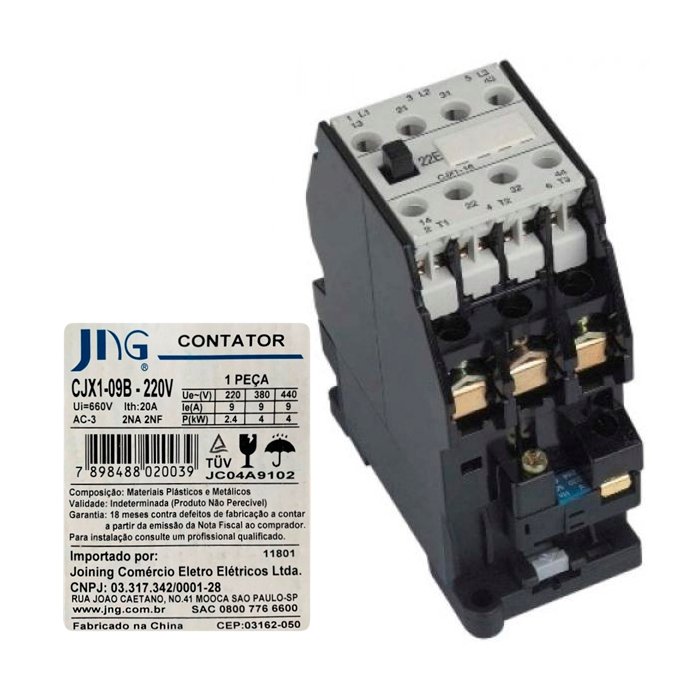 Descrição Contator Auxiliar Cjx1-09B(9 Amperes) 220V Faixa de ajuste 20a Fabricante :Jng Características Gerais: Tensão nominal de isolamento (Ui): 660Vca Contatos Principais: 3 contatos Contatos Auxiliares: 2NA + 2NF (inclusos) Durabilidade mecânica: 8.000.000 ciclos Durabilidade Elétrica: 1.200.000 ciclos Altitude máxima de operação: 2.000m Temperatura Ambiente: -20ºC a +50ºC Norma: IEC 60947-4-1 Alimentação da Bobina 220v