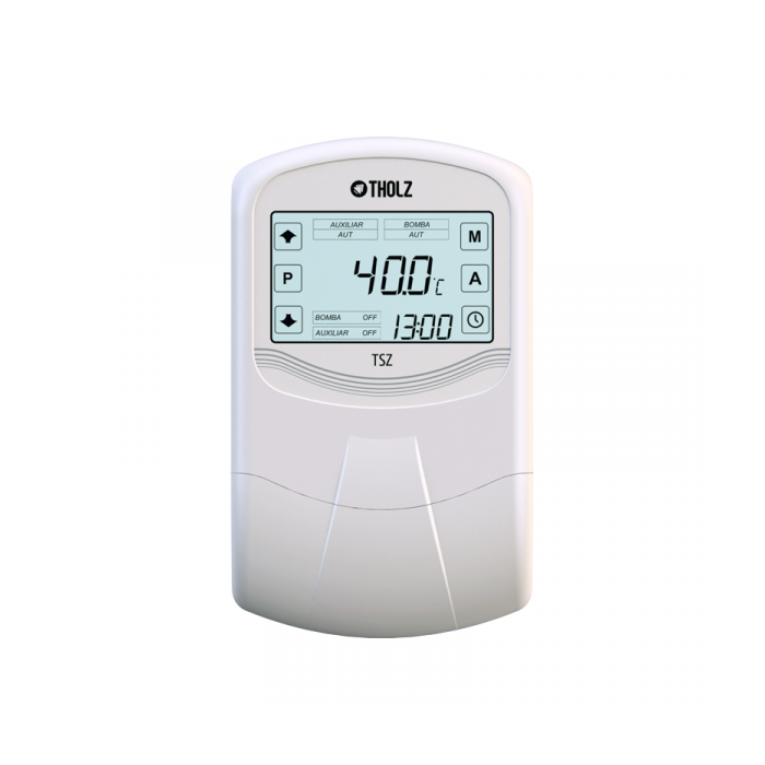 O TSZ é um equipamento digital projetado para aplicações de aquecimento solar com sistema de apoio, atuando no controle da circulação da água por diferencial de temperatura entre os coletores solares e o reservatório térmico e, quando necessário, ativa o sistema de apoio nos horários pré-programados. É indicado para o aquecimento de água para banho e dispõe de funções como proteção contra congelamento e sobreaquecimento do sistema. Pode realizar o aquecimento com recirculação do barrilete em horários pré-programados. As temperaturas, modos de operação, relógio e os estados das saídas são visualizados no display LCD. O instrumento possui três entradas para sensor de temperatura do tipo NTC, e três saídas de controle, uma para o acionamento da bomba do aquecimento solar e outras duas para os apoios.