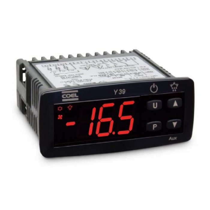O modelo y39 foi desenvolvido para aplicações em refrigeração com controle de temperatura on/off e controle de degelo por intervalo de tempos mediante parada do compressor, aquecimento elétrico ou gás quente com inversão de ciclo. O instrumento possui 3 saídas a relé e 3 entradas para sondas ntc, com a possibilidade de 1 entrada ser configurada como entrada digital. As 3 saídas podem ser configuradas para comando do compressor, degelo, ventilador, saída auxiliar ou alarme. As 3 entradas para sondas de temperatura são utilizadas para controle da temperatura ambiente, para monitorar a temperatura do evaporador e para medir uma temperatura auxiliar (exemplo: temperatura do produto). A entrada 2 ou 3 pode ser configurada como entrada digital e executar algumas funções como: sinalização de porta aberta, comando de degelo, seleção do Set Point de controle, sinalização de alarme externo, ativação do ciclo continuo, ativação da saída auxiliar.