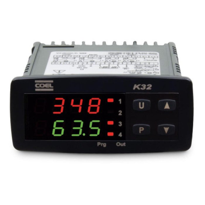 O modelo K32 é um controlador digital de temperatura e tempo para instalação em porta de painel com opção de comunicação serial RS485 MODBUS-RTU, 4 rampas e 4 patamares, 5 funções de temporização, controles ON/OFF, PID de ação simples e PID de ação dupla (direta e reversa), com funções de AUTOTUNE. O instrumento pode ter até 2 entradas digitais, 4 saídas a relé ou tensão para comando de relés de estado sólido (somente 1 saída). A entrada é configurável e aceita sensores de temperatura (termopares J, K, S, R, T; termoresistências Pt100). Outras importantes funções existentes no instrumento são: alarme de controle aberto (Loop-Break), alcance do Set Point a velocidade controlada, controle de aquecimento e de resfriamento, função de Soft-Start e proteção de parâmetros em vários níveis.