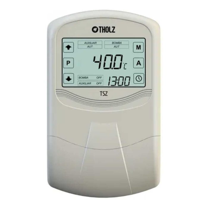 Controlador Eletrônico de Temperatura para Aquecimento Solar com Apoio TSZ 220V - Tholz O Controlador Eletrônico de Temperatura para Aquecimento Solar com Apoio TSZ 220V une o seu controlador para sistema de aquecimento solar com o termostato com programador horário.É um equipamento digital projetado para aplicações de aquecimento solar com sistema de apoio, atuando no controle da circulação da água através do diferencial de temperatura entre os coletores solares e o reservatório térmico e, quando necessário, ativa o apoio nos horários pré-programados. Ideal para o controle automatizado do aquecimento solar da água da sua piscina. O instrumento possui três entradas para sensor de temperatura do tipo NTC, e duas saídas de controle, uma para o acionamento da bomba e a outra para o apoio. O controlador restringe o acesso aos parâmetros de configuração através de um código de proteção, impedindo que a programação seja alterada acidentalmente. O controlador apresenta instalação e programação simplificada.