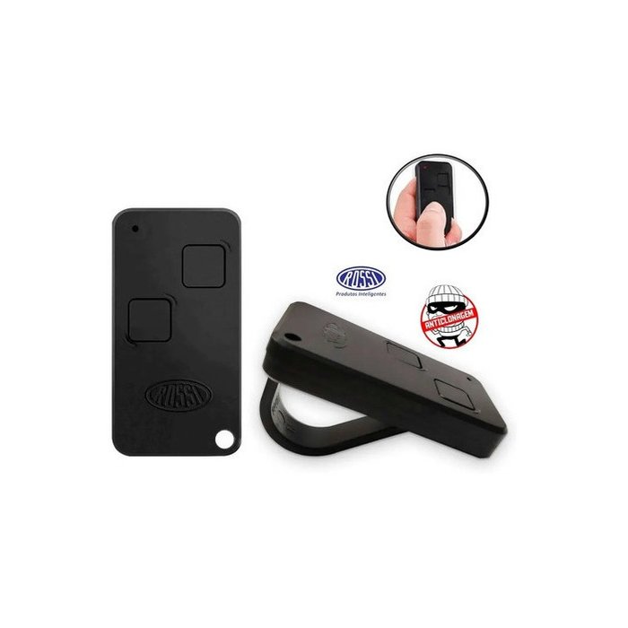CONTROLE ROSSI HCS Sistema de anticlonagem com até 4,3 bilhões de combinações; Memorização direta na central (sem raspagem de código); Rolagem do código a cada transmissão; Frequência 433Mhz; Incluso 01 bateria. X CAR CLICK ROSSI Praticidade: É só chegar com o carro e, com o farol alto acionar (abrir/fechar) o portão. Especialmente desenvolvido para ser instalado em carros, o Tx Click pode ser usado com o acionamento do farol alto ou em qualquer outro botão no painel do seu carro. Montado em tecnologia SMD e com sistema de codificação Holling Code que possui mais de 4 bilhões de códigos diferentes; garantindo que cada transmissão seja única e livre de clonagem. Frequência de transmissão fixa por ressonador SAW Obs.: Exclusivo para motores da marca Rossi. Especificações Frequência 433MhZ Distância máxima de alcance: 30 Metros sem barreiras Fabricante: Rossi Configuração dos Controles Pressione e solte o botão Aprender da sua central de comando, com o Led ainda aceso pressione um dos botões do controle, o Led ST do receptor piscará indicando que a programação foi aceita. Repita o processo para o outro botão do controle.