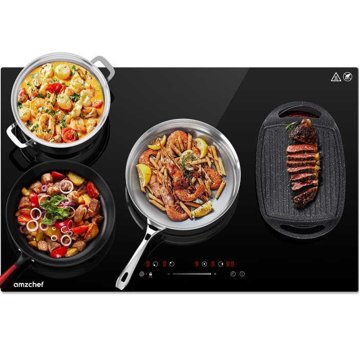 | Cooktop Elétrico AMZCHEF 30" Embutido com 4 Bocas, 9 Níveis de Aquecimento, Timer, Trava de Segurança Infantil e Controle Touch (Preto)