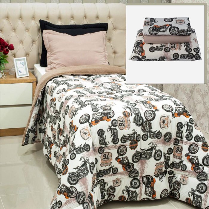 Coordenado Coberdrom Edredom e Lençol Solteiro 4 Peças Moto - Bege Top Chick
