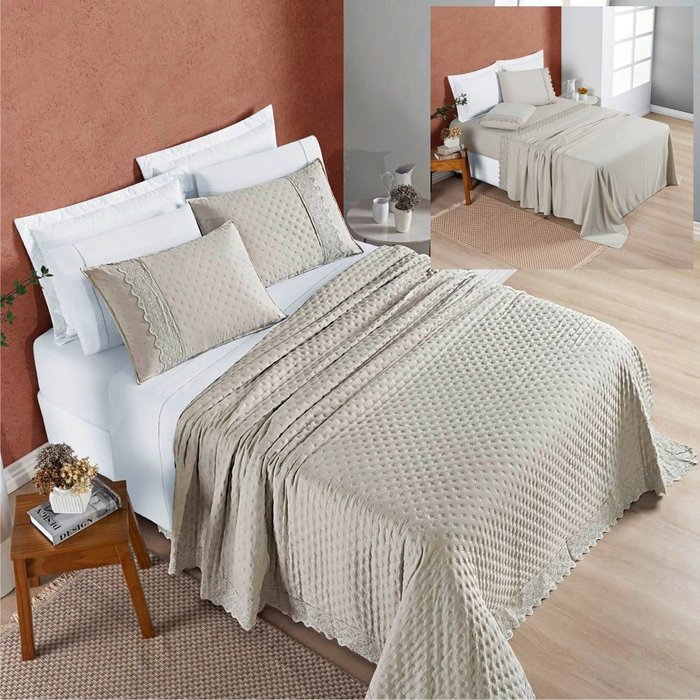 O cobre leito, com seu design coordenado, apresenta detalhes refinados e acabamentos impecáveis, adicionando um toque de glamour ao seu quarto. A textura suave e agradável ao toque do tecido charmousse elevam a experiência de dormir a um novo patamar, envolvendo-o em uma sensação de luxo e aconchego.