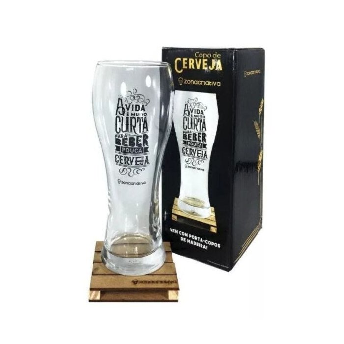 Copão de Chope A Vida é Muito Curta Copão de chope com a frase "A Vida é Muito Curta Para Beber Pouca Cerveja". Aquele copo de respeito, que refresca a mente! De vidro e com capacidade para 680 ml. Vem com um lindo Porta Copo de madeira! Medida do Copo: Altura: 22,0 cm Diâmetro: 9,0 cm Peso: 455 g Medida do Porta Copo: Altura: 1,5 cm largura: 9,0 cm Comprimento: 9,0 cm Peso: 40 g Marca: Zona Criativa