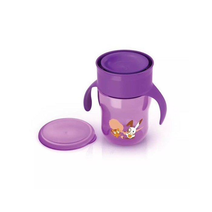 O COPO 360 - PHILIPS AVENT 260ml , possui alça e tampa higiênica, ideal para usar em casa ou em viagens. Com sistema anti-vazamento, possui um mecanismo que estimula naturalmente o desenvolvimento da musculatura orofacial da criança, através de uma válvula anti-vazamento 360º. O copo pode ser girado e o líquido não derrama. O líquido só é liberado quando o lábio da criança pressiona essa válvula para baixo.