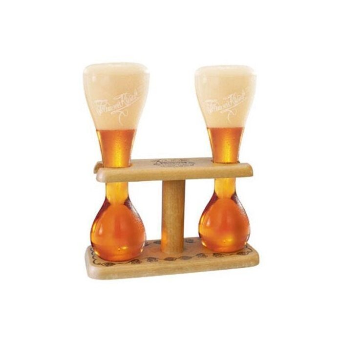 Copo Duo da tradicional Cerveja Belga Kwak com capacidade para 300 ml em cada copo. Acompanha o Kit um lindo suporte em madeira para os dois copos.